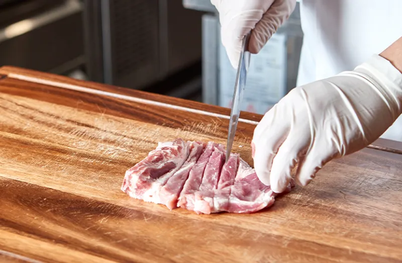 국내산 돼지갈비만을 사용해 고기 품질에 대한 자부심이 다릅니다. 뼈가 붙은 갈비를 6~7mm 두께로 정성껏 손질하고, 양면 칼집을 넣어 양념이 속까지 잘 배도록 세심하게 준비했어요. 두께는 얇지 않지만 부담 없이 구워 먹기 딱 좋은 최적의 컷이죠.