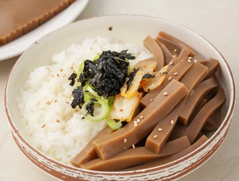 뜨거운 물에 살짝 데치면 요리하기 참 좋아요. 묵사발이나 김가루와 참기름, 깨 등을 넣고 버무려 보세요. 깔끔하고 부드러운 묵의 풍미가 입맛을 돋우어 줄 거예요.