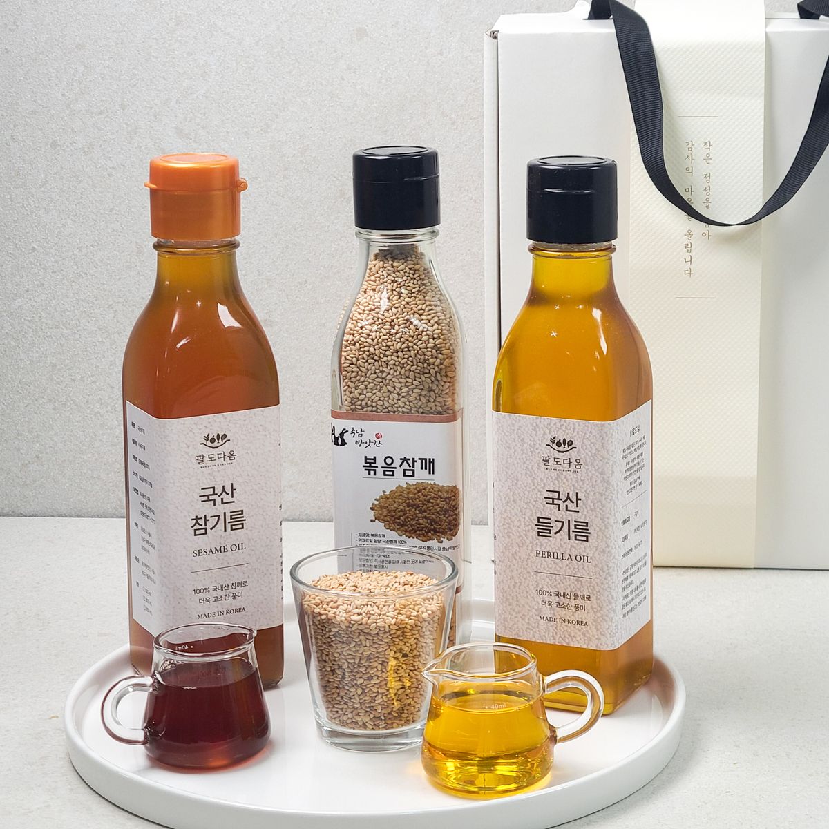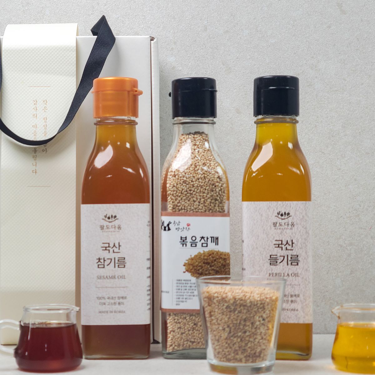 참기름 300ml: 100% 국산 참깨를 저온 착유한 참기름입니다. 고소하면서도 깔끔한 맛이 중독성 있어요. 들기름 300ml : 100% 국산 들깨를 저온 착유한 들기름입니다. 산뜻한 들깨 냄새가 풍미를 올려줘요. 볶음 참깨 150g : 맛있게 볶은 볶음 참깨에요. 다양한 요리에 뿌려드시면 참깨의 고소한 내음과 풍미를 올려준답니다.