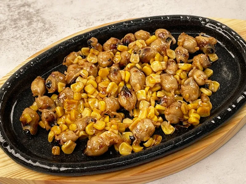오징어입과 가장 잘 어울리는 톡톡 튀는 옥수수는 버터에 따로 볶아낸 다음 듬뿍 담아드립니다.