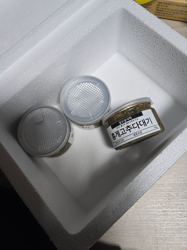 아이스팩 작은 한개로 왔는데 겨울이 아니였으면 제품이 망가질 수도 있을것같아요 홍게살이 정말 많이 들어있어 매운맛은 시간이 지날수록 올라와서 꽤 매운 제품이네요 색다른 제품을 드시고 싶다면 추천