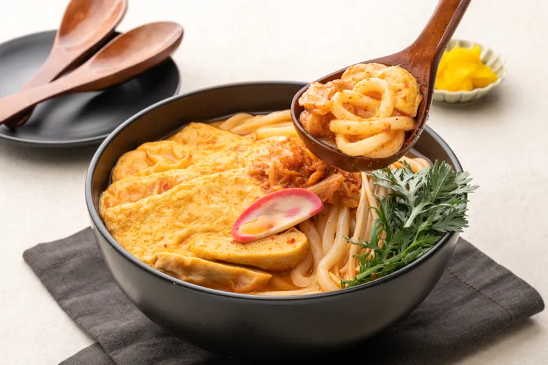 잘 익은 김치를 더해 칼칼해진 김치어묵 우동전골이에요. 어육함량을 높여 탱글탱글한 어묵살이 그대로 느껴지는 어묵을 사용한답니다. 탱글탱글한 면과 어묵 그리고 얼큰한 국물의 조화! 감칠맛이 일품이에요.
