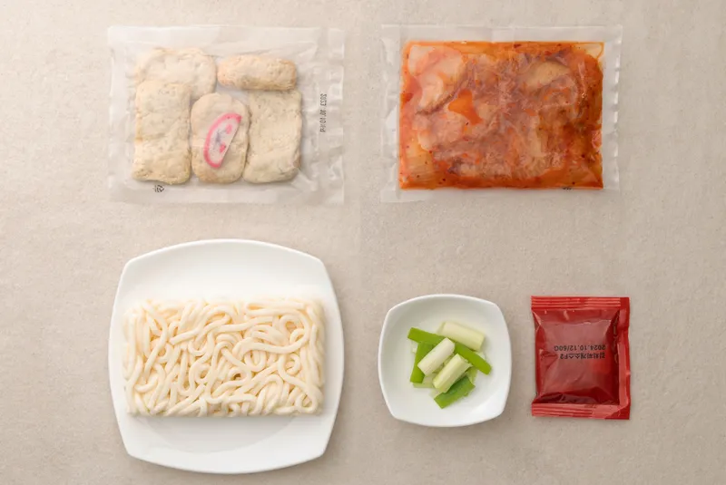 볶음김치, 모둠어묵, 파 슬라이스, 우동면, 김치전골소스 구성입니다.