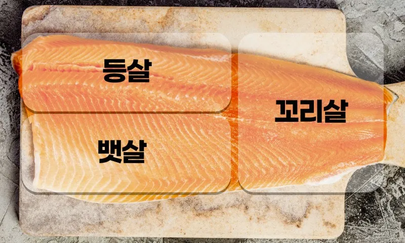 연어는 등살, 뱃살, 꼬릿살 세부위로 나누어져요.