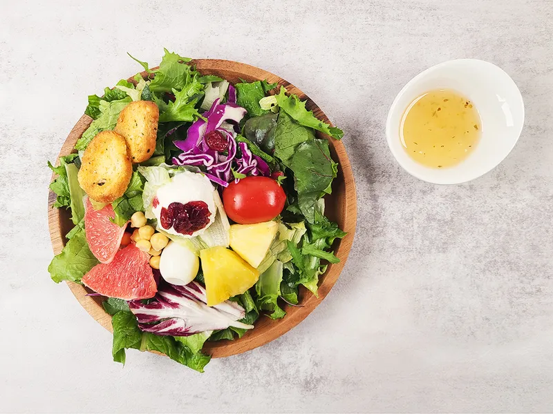 각종 과일과 채소, 그리고 달걀, 불고기로 고소함을 더했습니다. 채소만 먹기 싫을 때 단백질도 충전 완료 해보세요! 마요네즈가 함유된 스위트 레몬 드레싱으로 준비했어요.