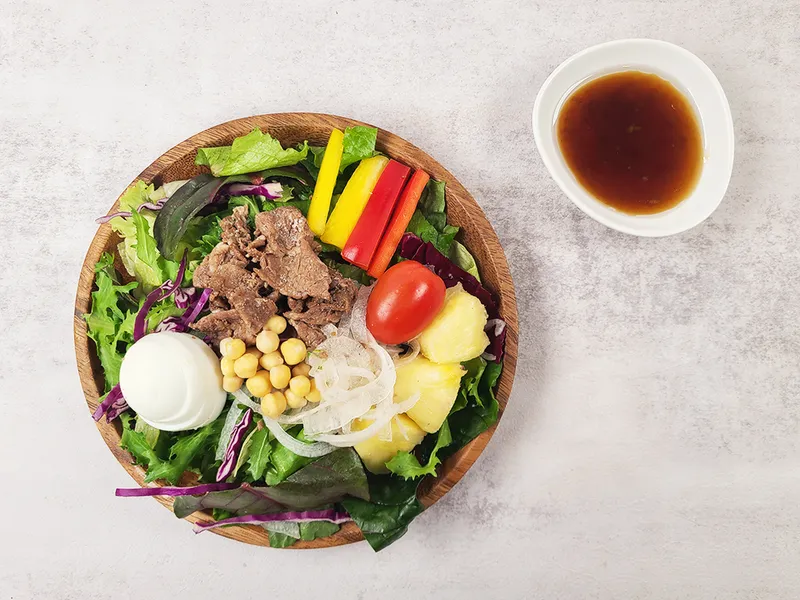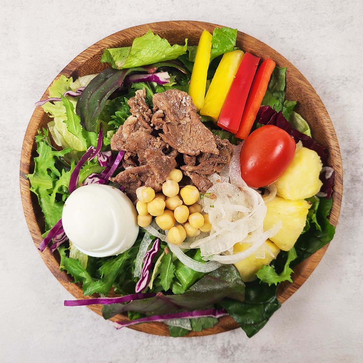 각종 과일과 채소, 그리고 달걀, 불고기로 고소함을 더했습니다. 채소만 먹기 싫을 때 단백질도 충전 완료 해보세요! 근본 중에 근본, 오리엔탈 드레싱으로 준비했어요.