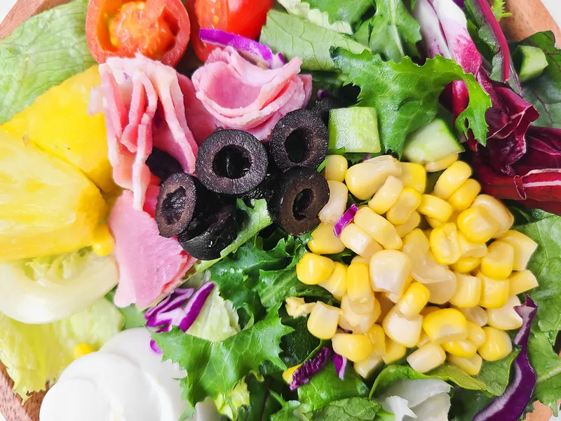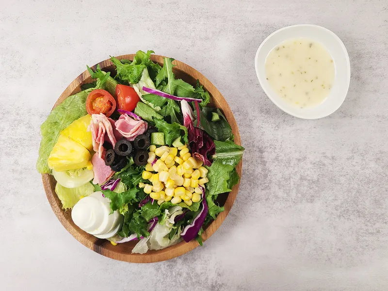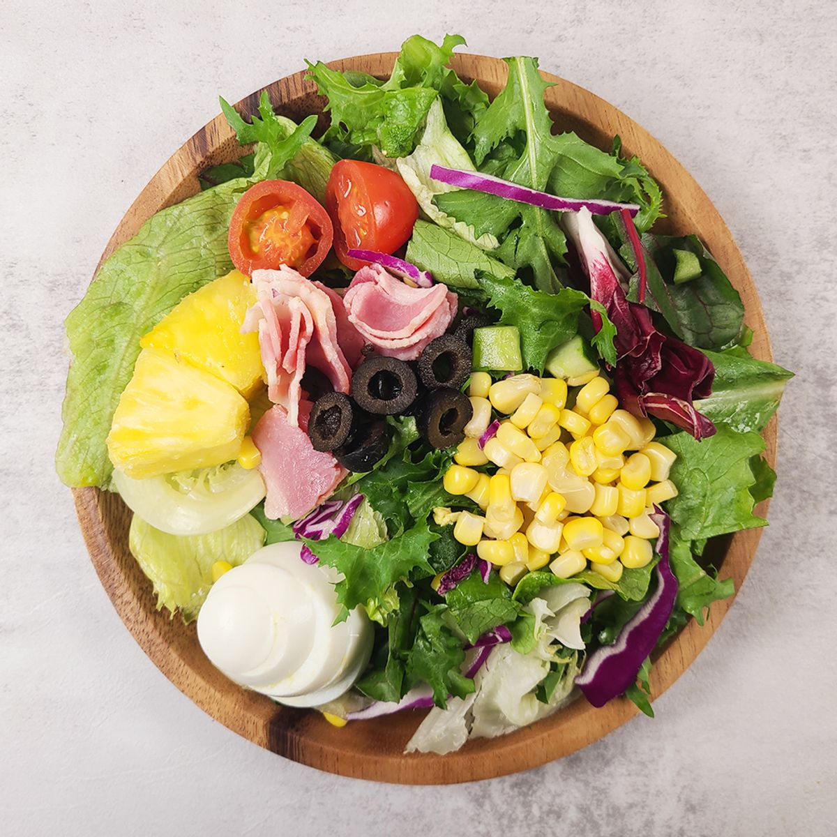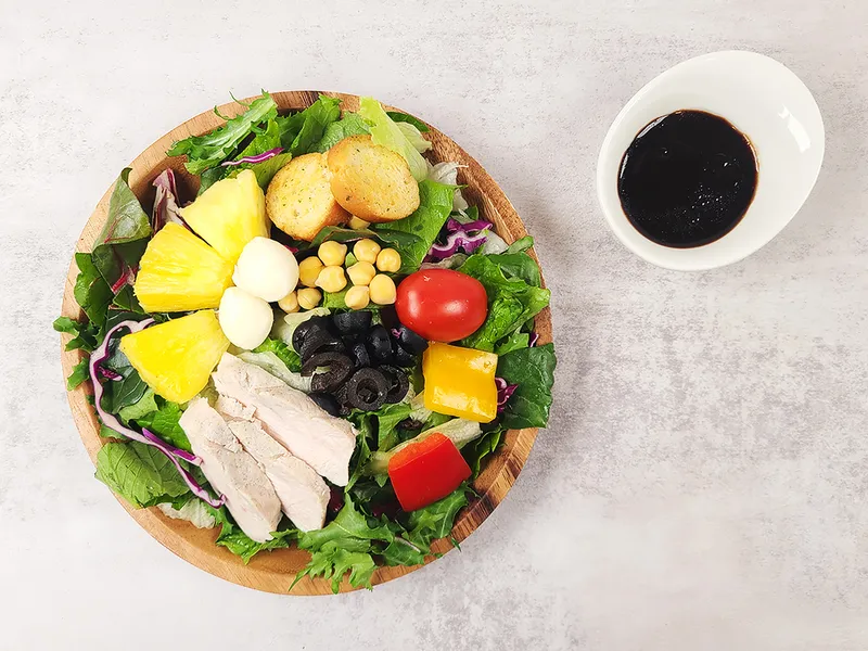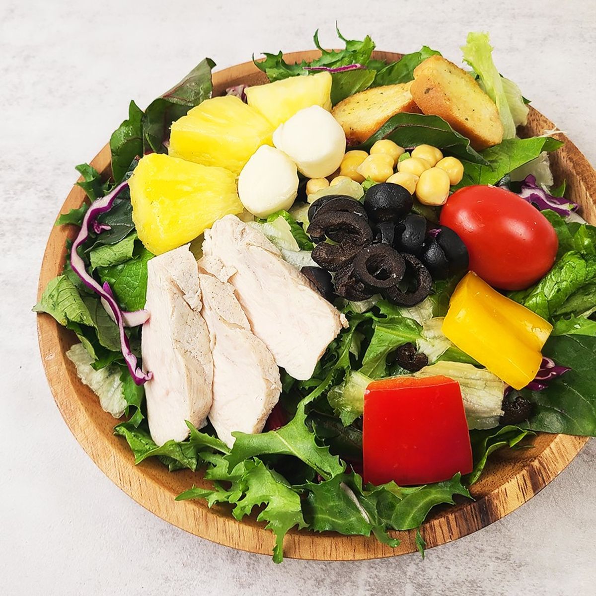파인애플 열매, 상추, 방울토마토, 치즈, 발사믹 소스 등으로 구성되어 있습니다. 채소로 지칠 때 쯤, 상큼한 과일을 드셔보세요!