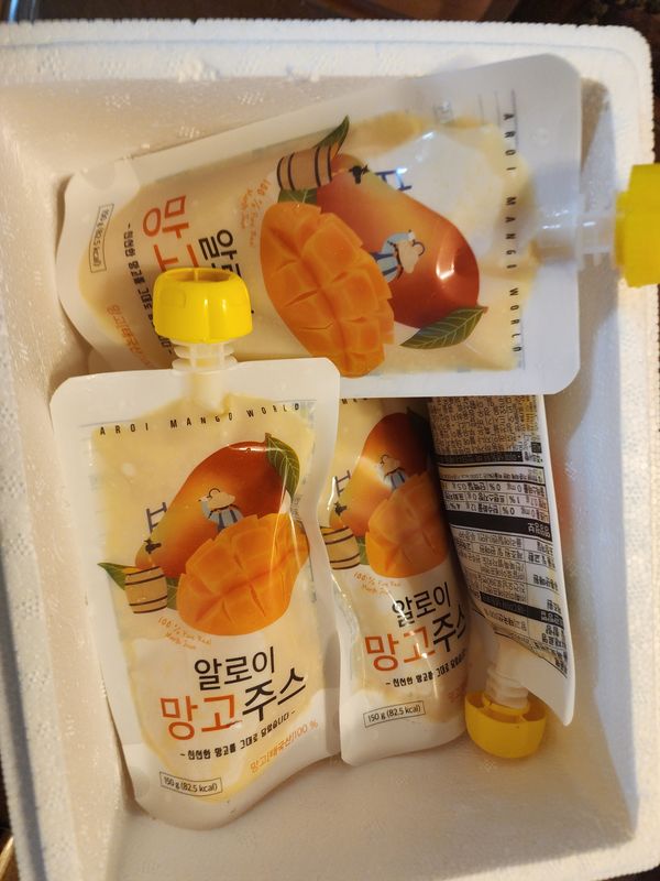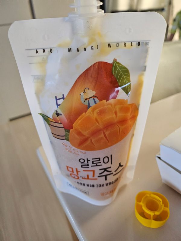 망고주스라기 보다는 망고를 통째로 아무것도 넣지않고 갈은 느낌이네요. 그래서 걸죽해서 마시기 보다는 스푼으로 떠먹어야 더 어울릴듯요~ 아님 포장팩째 얼려 슬러시처럼 짜먹든가 하면 아이들이 좋아할듯 합니다.