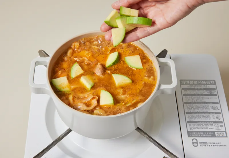 4. 물이 끓기 시작하면 각종 야채를 넣어 주세요. (김치 청국장을 만드실 때는 김치를 먼저 넣고 끓여 주세요)