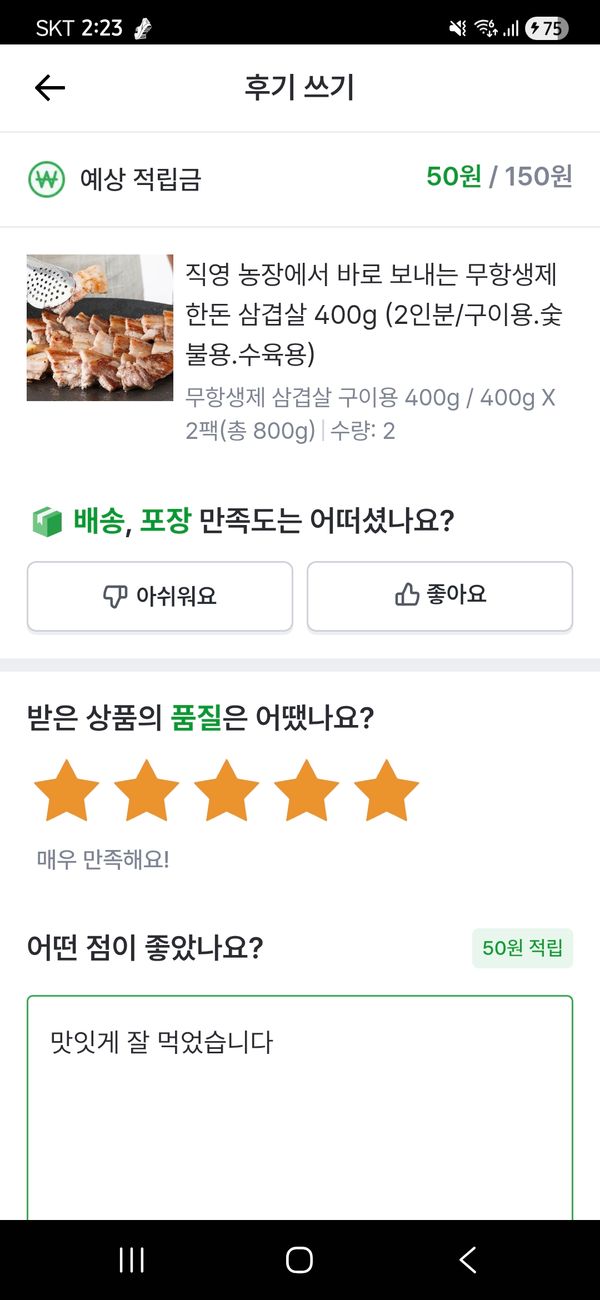 수육용인데 친정동생이 갑자기 집에 오게되서 수육재료가 없어서 김치랑 급하게 찌개 처럼 먹었는데 육향이 나고 고기가 좁은 축사에 있는 돼지 같지 않게 쫀득했어요 아마 1인실 돼지우리에 움직일 공간없이 자란 돼지는 아닌것 같았어요 껍질이며 살이 쫀득해서 활동하는 돼지구나 싶었어요 다음에는 찐 수육으로 제대로 먹어보고 싶네요