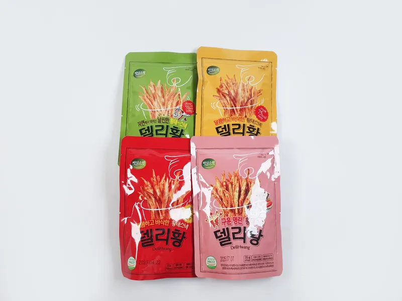 손이 가는 건강 간식 황태 과자 4종입니다. 닭가슴살이나 소고기랑 비교해도 월등히 높은 단백질 함량을 가지고 있을 뿐만 아니라 한 봉지에 기본 맛 기준 55칼로리로 죄책감 없이 챙겨 먹을 수 있는 간식이에요.