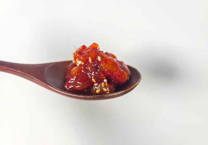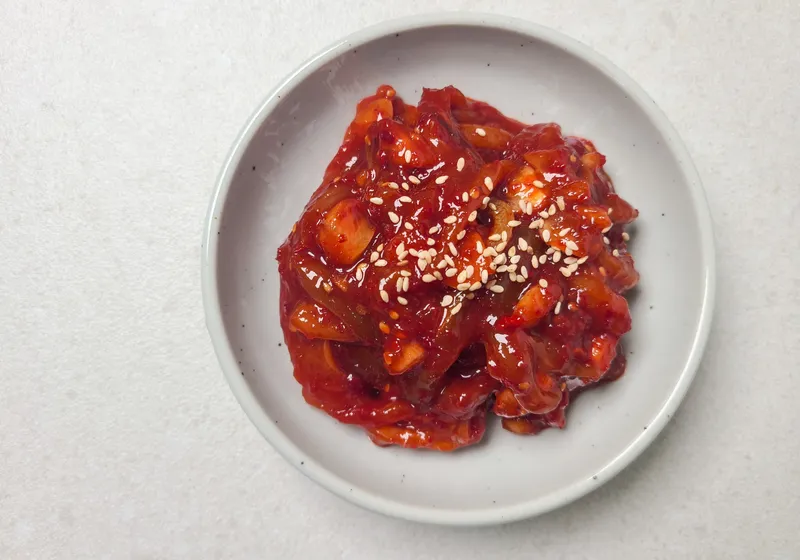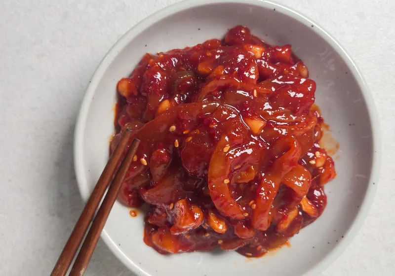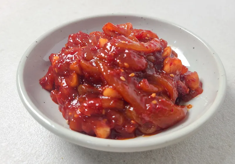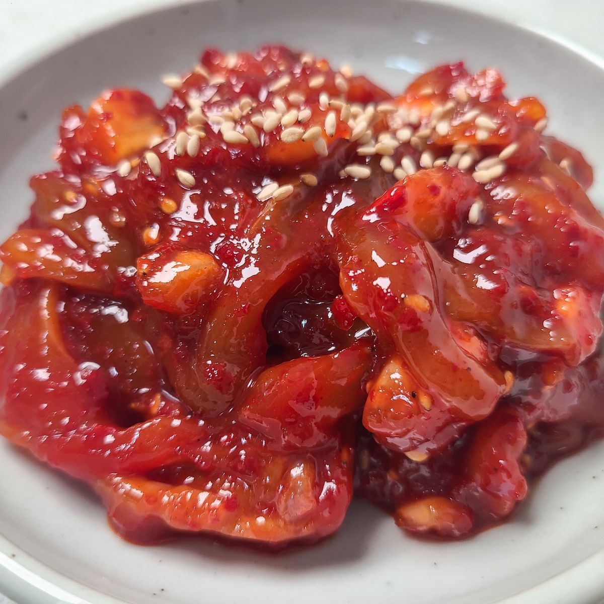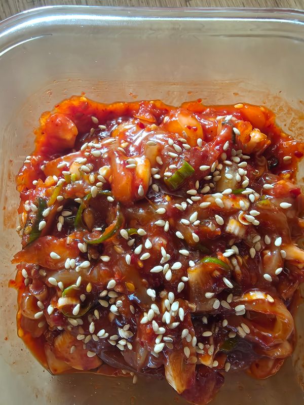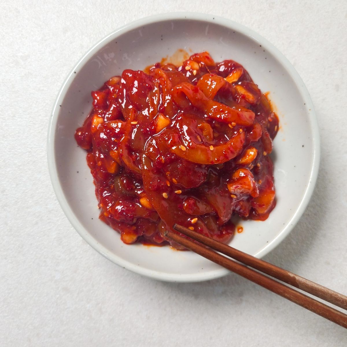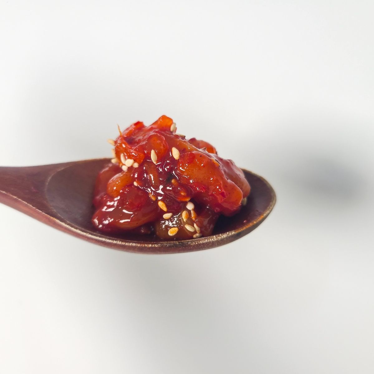 신선한 오징어를 엄선해 소금으로 절인 후 전통 방식으로 숙성했어요. 오징어 본연의 쫄깃한 식감과 감칠맛이 살아있답니다. 고춧가루의 알싸한 매콤함과 마늘, 생강의 향긋한 맛이 조화롭게 어우러져요!