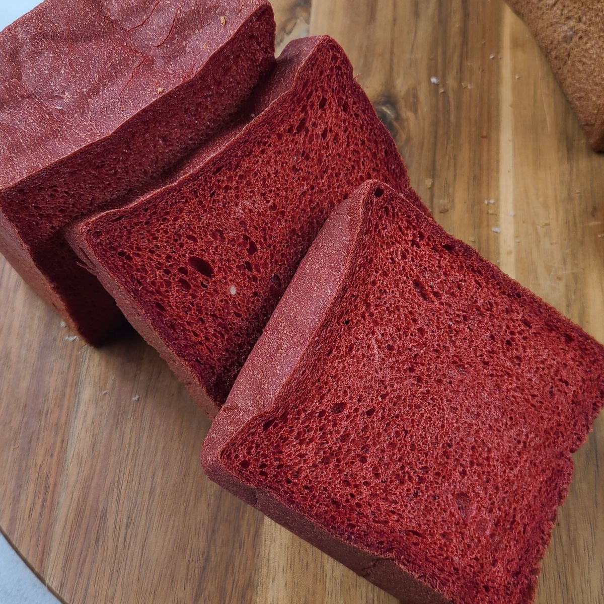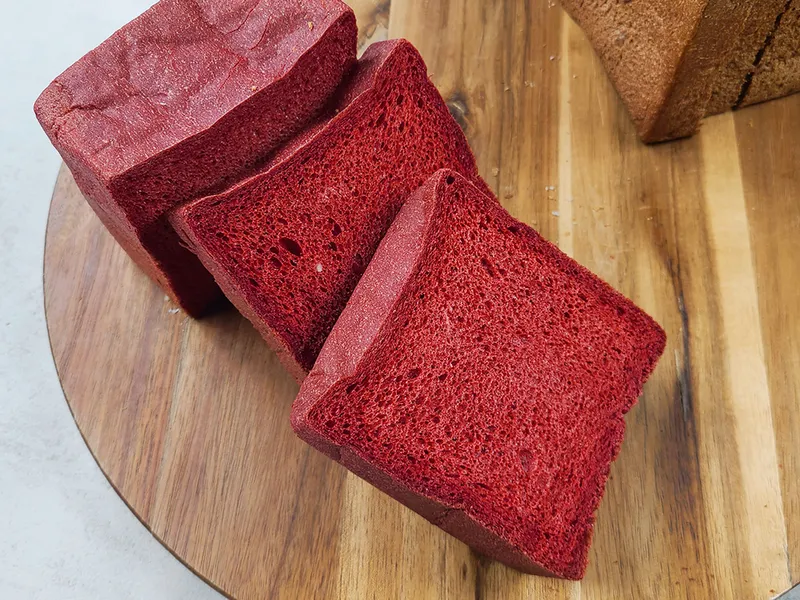 색도 맛도 이목을 사로잡는 빨간 홍국쌀 식빵입니다. 천연 색소인 홍국 쌀가루로 맛을 냈어요.