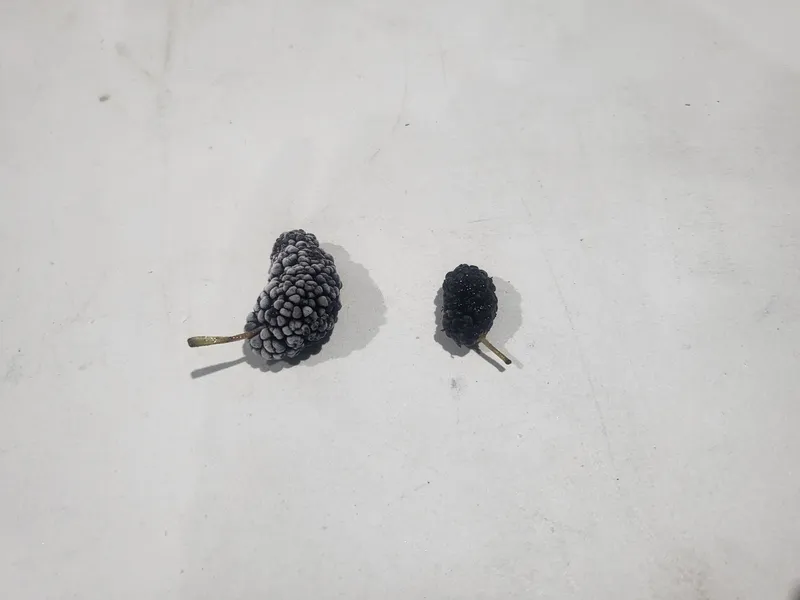 왼쪽이 과상 2호, 오른쪽이 토종 오디입니다. 과상 오디는 알이 큼직하고, 식감이 좋으며 당도가 높은 것이 특징이며, 보통 생과로 많이 드십니다. 오디 품종 중에서는 가장 프리미엄 품종이라고 할 수 있습니다. 토종 오디는 크기는 작으나 당도가 좋으며, 보통 오디청, 쨈용, 엑기스용, 담금주용과 같은 가공용으로 사용 됩니다.