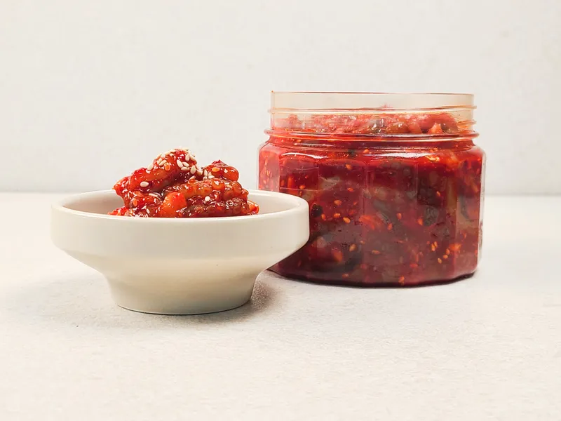 쫄깃한 낙지를 잘게 썰어 매콤한 양념에 버무려 숙성시킨 전통 젓갈이에요. 탱글한 식감과 바다의 짭조름한 풍미가 어우러져 한 입만으로도 밥맛을 확 끌어올려 준답니다. 깔끔한 매콤함이 은근히 중독성 있어요.
