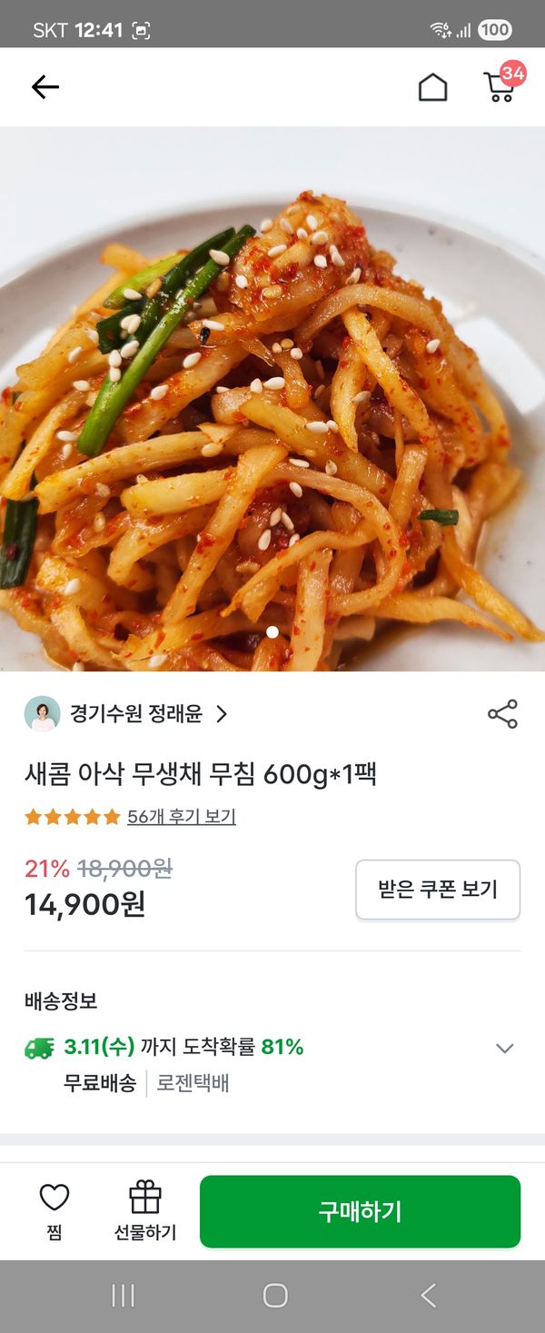 포장도 꼼꼼하고 배송도 빨라요 무생채가 아삭하고 양념도 칼칼해서 맛있어요 ㄱ