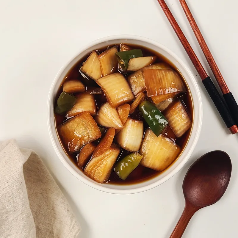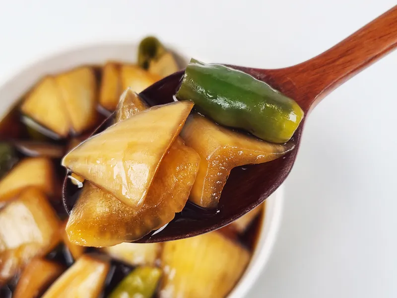 황금 비율의 장아찌 소스를 사용합니다. 장아찌 소스는 약한 불에서 3시간 정도 은은하게 끓인 다음 원재료에 부어 3일간 저온 숙성시키기 때문에 보다 깊은 맛이 납니다.