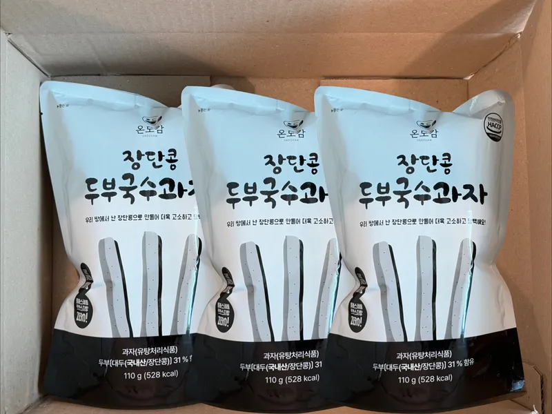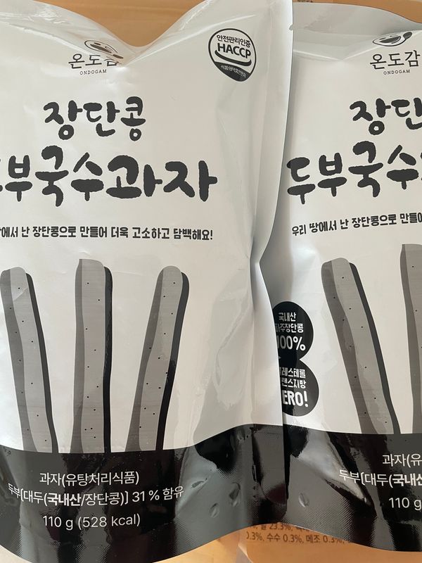 국내산 청정지역 파주 장단콩 두부로 만든 고소한 두부국수과자를 만나보세요! 두부를 무려 31%나 함유하여 두부 특유의 고소한 풍미를 가득 느껴볼 수 있습니다. 기다란 국수형 과자로 바삭바삭하면서 오도독한 식감을 더 오래 즐길 수도 있죠.
