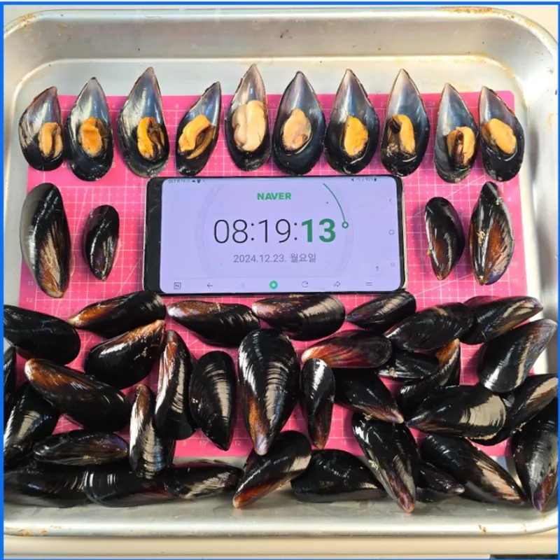 홍합 하나하나 세척하기 번거로우시죠? 그 마음 잘 알기에 배에서 1번 공장에서 2번 세척하고 깨진 껍질 크기 선별 작업을 다시 합니다