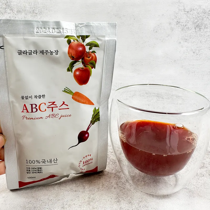 ABC 주스는 사과(apple)·비트(beet)·당근(carrot)을 넣어 만든 주스를 말합니다. 집에서 직접 만든 것처럼 신선한 맛을 느끼실 수 있어요.