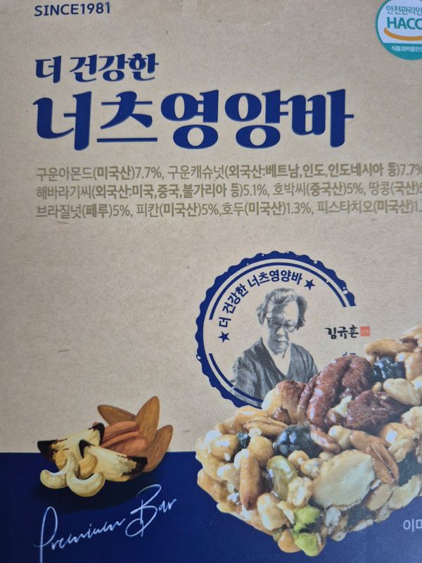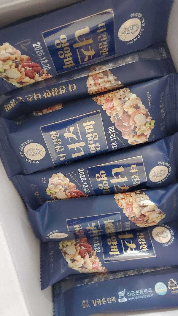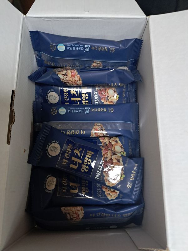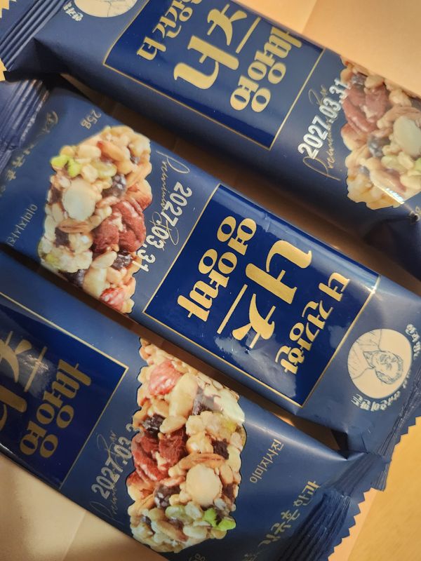 넛츠바 영양바 사서 반반씩 담아 간단히 선물할려구요 영양바는 부드러워서 먹기 편하니까 좋은 점이 있어요 넛츠바는 견과류 대신 먹는 느낌이구요