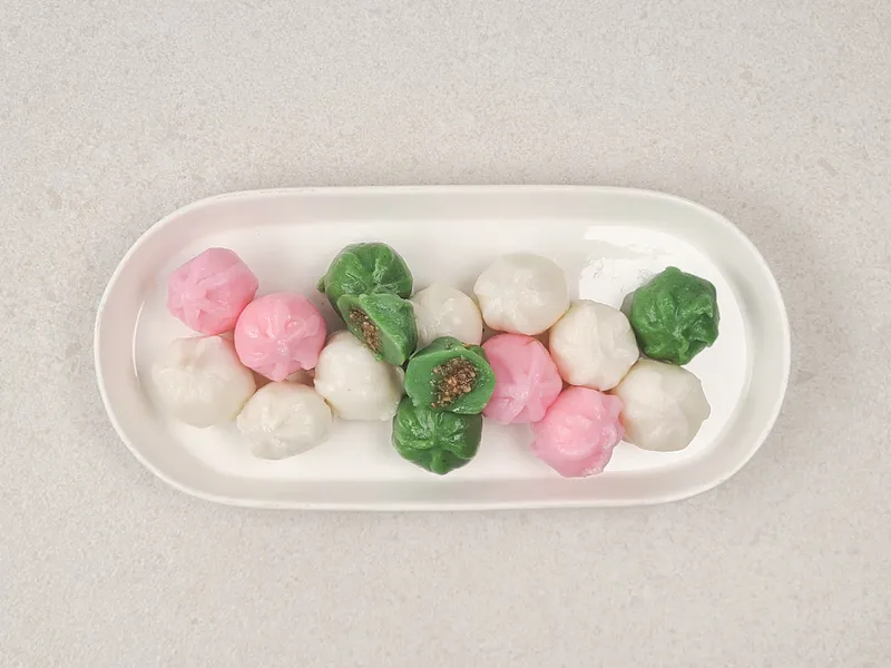 흰색, 분홍색, 녹색의 자연스러운 색감이 매력적인 삼색 꿀떡이에요. 보기에도 예쁘고 맛도 있어 선물용으로 제격입니다.