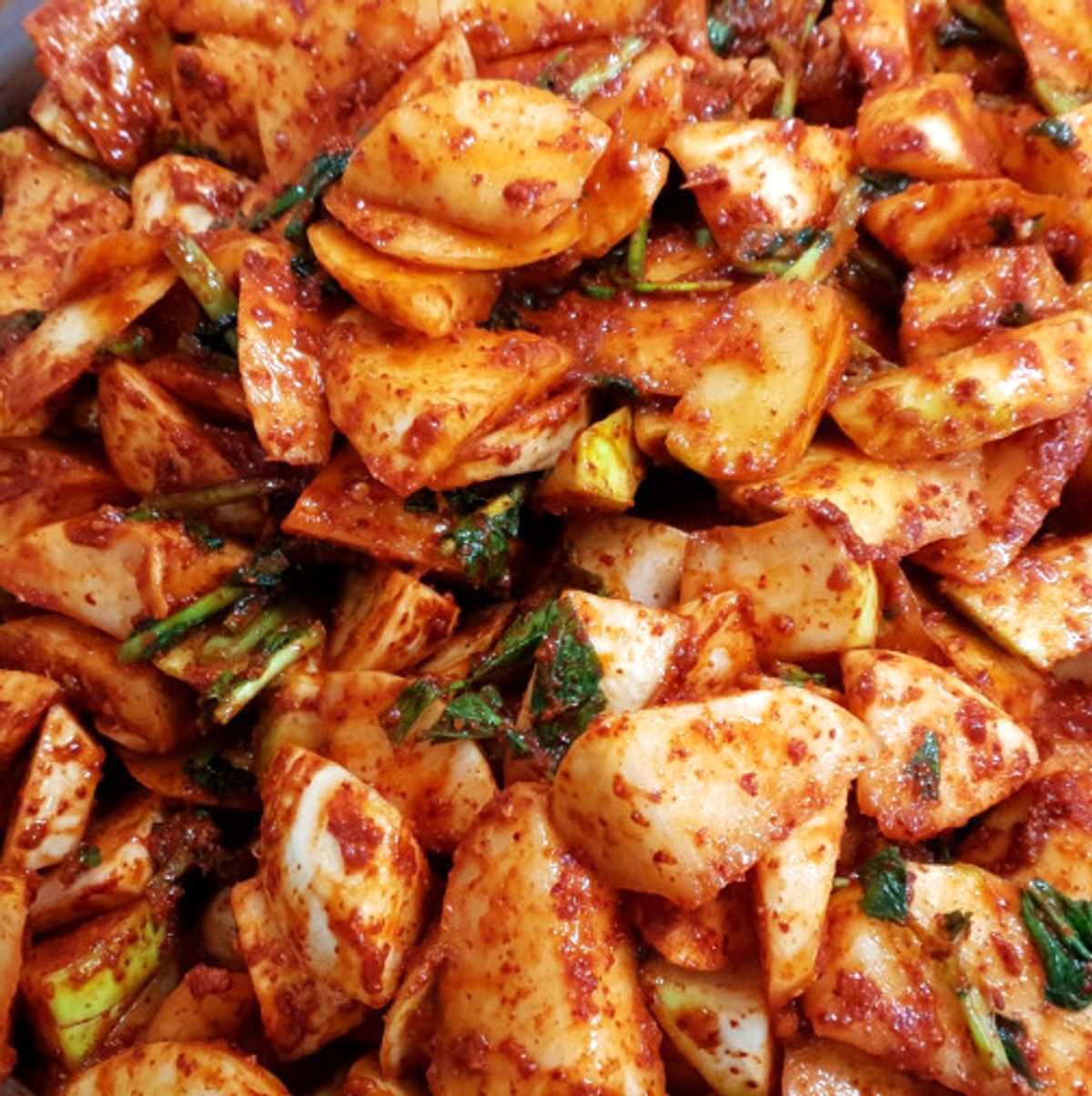 30년 넘게 김치를 만들고 계신 어머니의 레시피로 만든 김치입니다. 우리 가족이 먹는다는 생각으로 국산 재료로만 만들었습니다. 영양가 많은 무청달린 무가 나오는 시기에는 무청의 연한 부분만 골라 같이 담아드리고 있습니다.