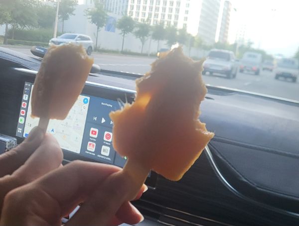딸램이 맛있다고 출근길에 차안에서 먹으면서가는걸 찍어서 보냈네요 .