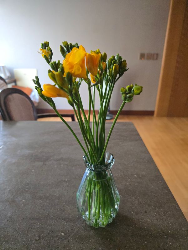 프리지아 길이가 얇긴한데 이뻐요 봉우리 안핀상태로 와서 오래볼수있을것 같아 물올림하고 놓고사진찍었는데 너무 마음에 들어요