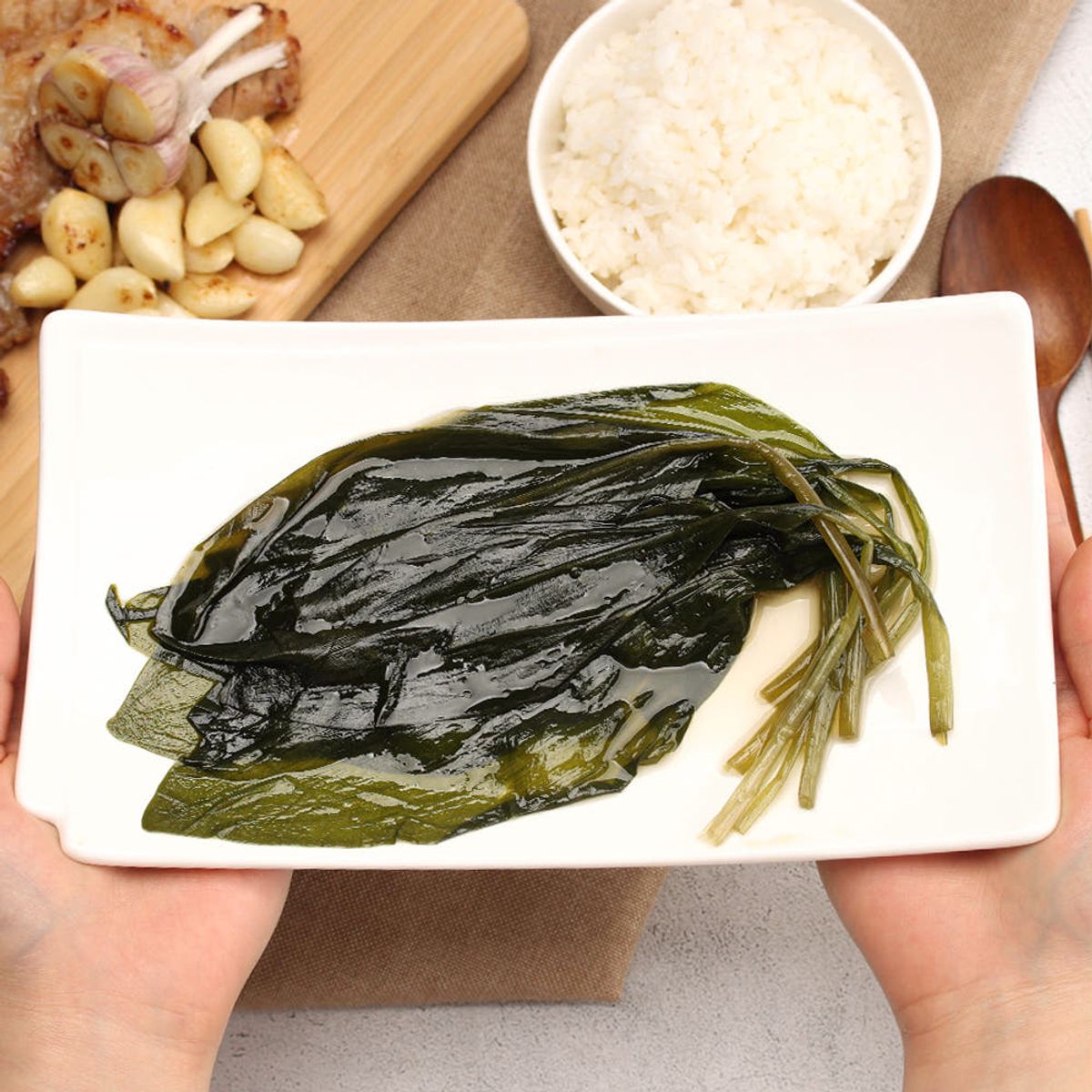 싱그러운 명이나물을 정성스럽게 손질했어요. 마늘에 살짝 말아먹으면 은은한 향과 알싸한 맛이 일품입니다. 깔끔한 조리법으로 자연스러운 야채 풍미를 그대로 담았죠.