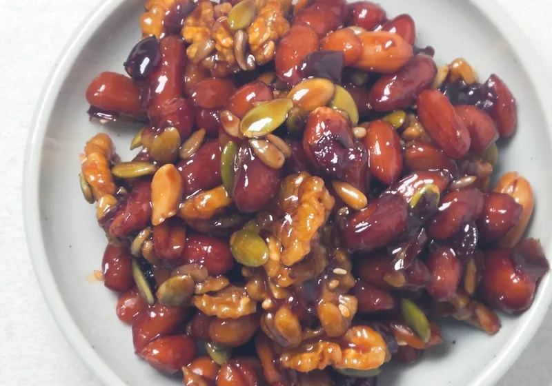호두, 땅콩, 브라질넛, 해바라기씨, 호박씨, 무화과, 크렌베리로 구성된 이 견과 조림은 바삭한 식감이 매력적이에요. 오독오독 씹히는 맛이 중독성 있어 자꾸만 손이 갑니다. 단짠단짠한 맛이 입안에서 조화롭게 어우러져요.