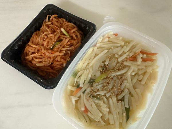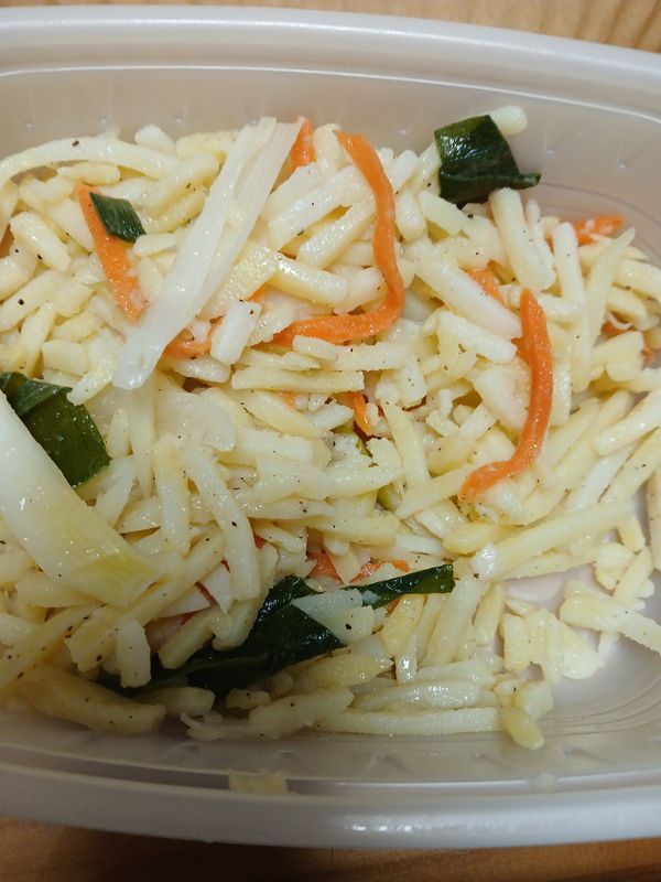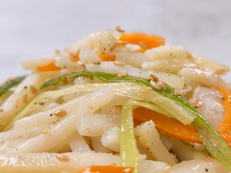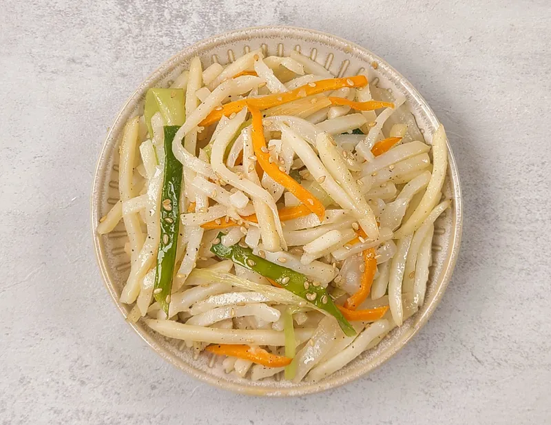 심심하게 간을 해 감자 본연의 맛을 느낄 수 있는 감자채볶음! 각종 야채가 함께 들어가 식감도 다채로워요.