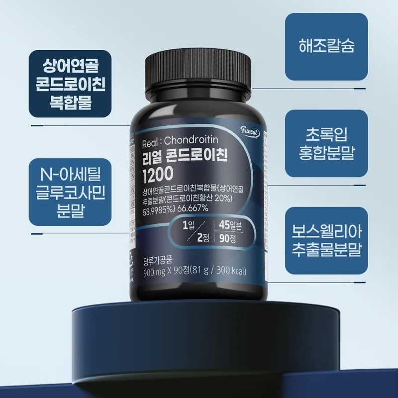 튼튼한 뼈, 연골 건강을 위해 상어연골 콘드로이친 복합물 외에도 4가지 원료(N-아세틸 글루코사민 분말, 해조 칼슘, 초록입 홍합 분말, 보스웰리아 추출물 분말)를 넣어 1정에 꽉 채웠습니다.