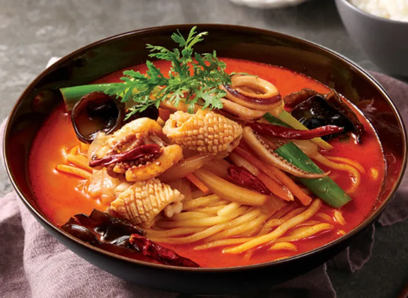 한식 조리법을 적용해 특급 레시피 비법소스로 만들었습니다. 깊고 진한 국물에는 국내산 야채와 오동통 오징어를 듬뿍 넣었습니다!