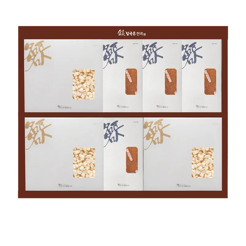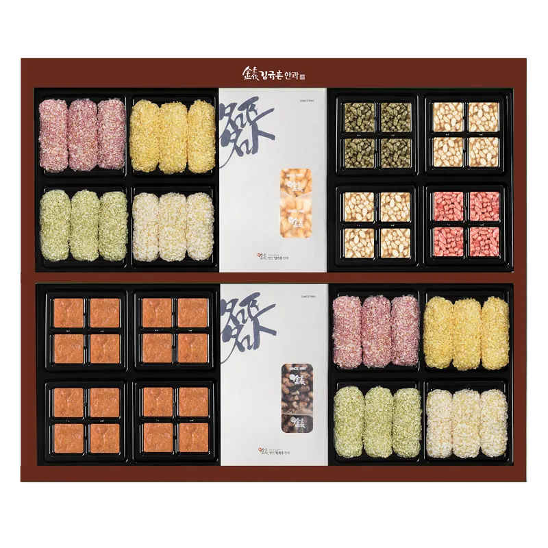 2단으로 이루어진 상자 안에는 약과, 강정, 유과가 다채롭게 들어가 있습니다. 국내산 꿀과 조청을 사용해 깊은 풍미를 주는 꿀약과! 국내산 찹쌀을 발효하여 겉은 바삭, 속은 쫀득한 식감을 살린 유과까지! 맛있는 전통간식을 즐겨보세요.