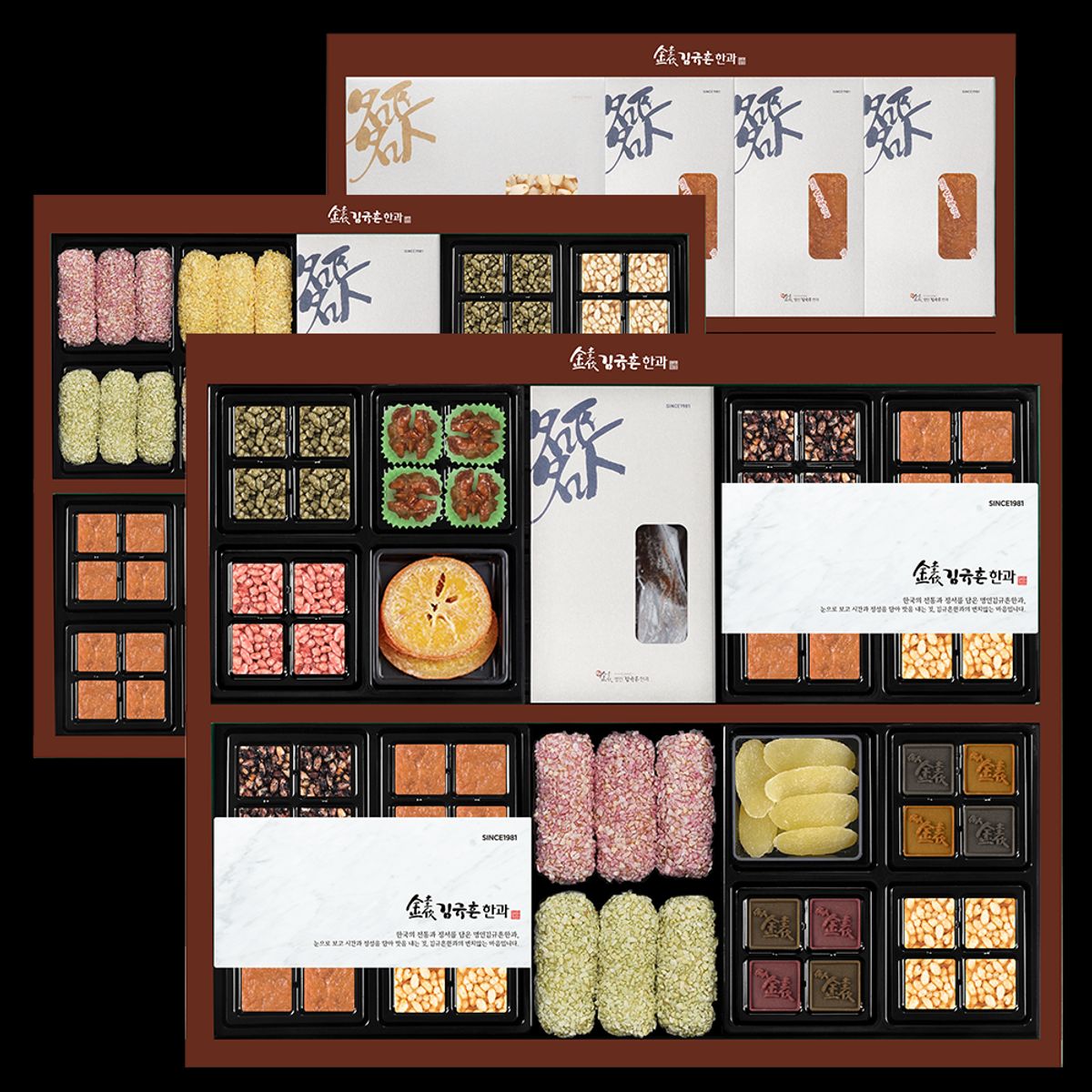 [약과] 꿀약과 / [유과] 백련초, 뽕잎 / [강정] 백련초, 현미, 쑥, 흑미, 호두 / [다식] 녹차,백련초, 시금치,호박 / [정과] 사과, 오렌지, 도라지 구성입니다.