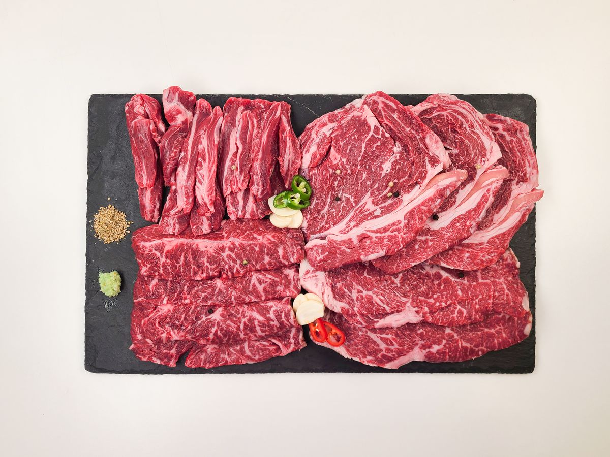 저렴한 구이 부위가 아닌 소고기 구이 메뉴의 대표주자 등심, 채끝, 부채, 갈비 로 각각 200g 씩 총 800g의 소고기 구이 모둠 입니다. 총 4~5인분의 넉넉한 양으로 온가족 맛있게 한끼 식사로 좋은 구성 입니다.