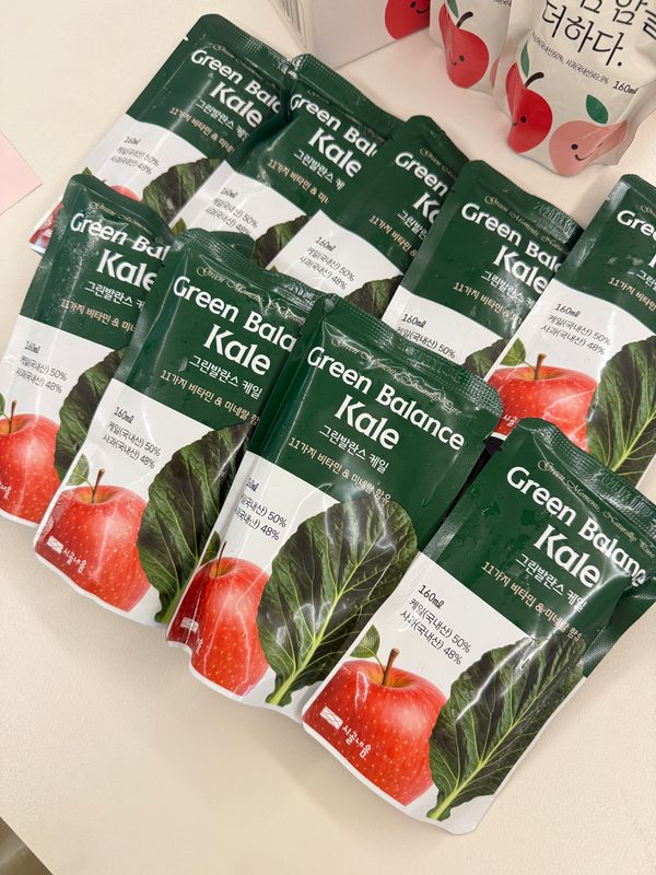 야채,과일을 잘안먹는 저에게 딱인거 같아요 :D 케일에다가 사과까지 있어서 먹기가 좋아요!! 포장도 세심하게 신경을 쓰셔서 보온박스에 보냉지안에 케일사과주스를 넣어주셔서 녹지않았더라구요~ (완전 세심하심 ^^) 냉동실에 넣어놨다가 담날아침에 먹을꺼만 냉장실에 넣고 먹음 되겠네요~ 배송도 빠르고!!  잘 마시겠습니다 ^^*