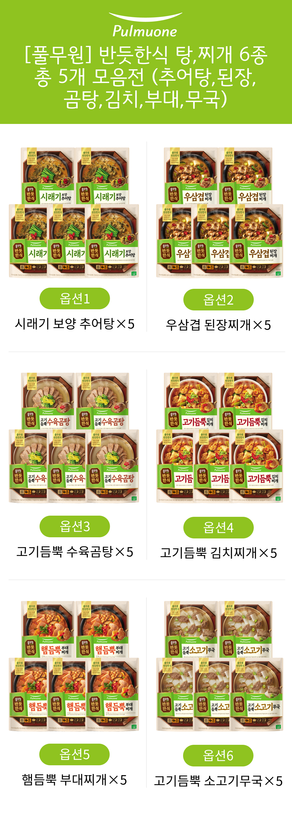 [풀무원] 반듯한식 탕,찌개 6종 5개 골라담기 (추어탕,된장,곰탕,김치,부대,무국)