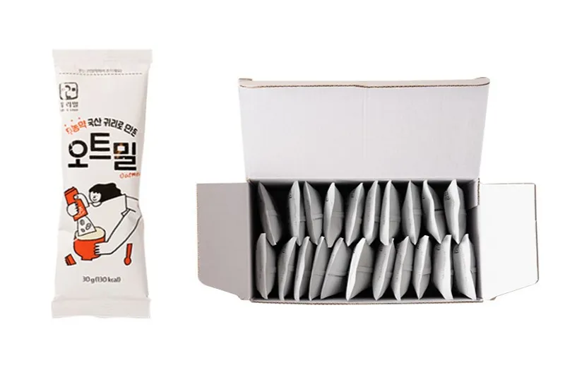 한끼 먹기 딱 좋은 양으로 포장했습니다. 스틱 하나에 오트밀이 30g씩 들어있어요. 한 상자에 21봉으로 구성되어 있습니다.