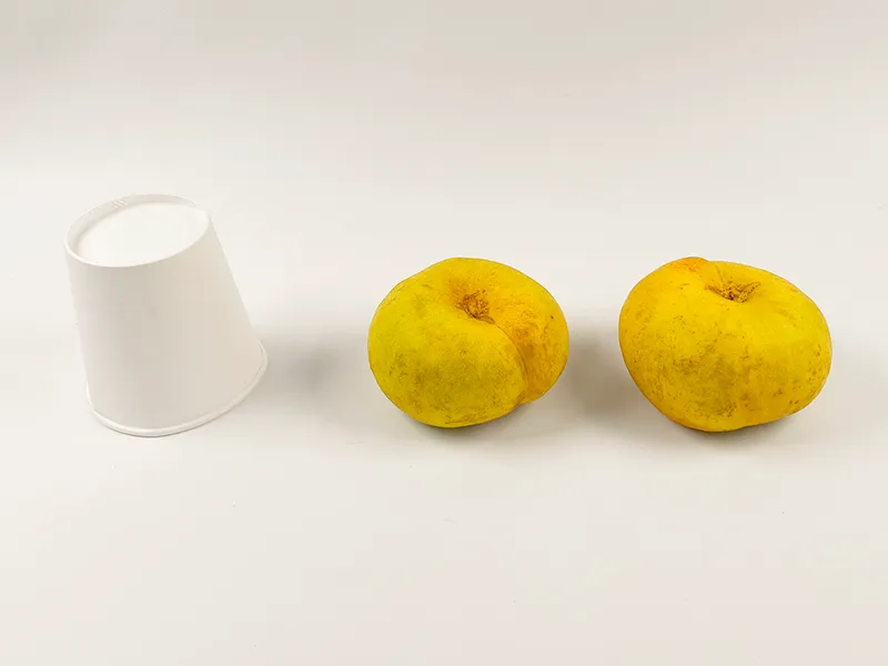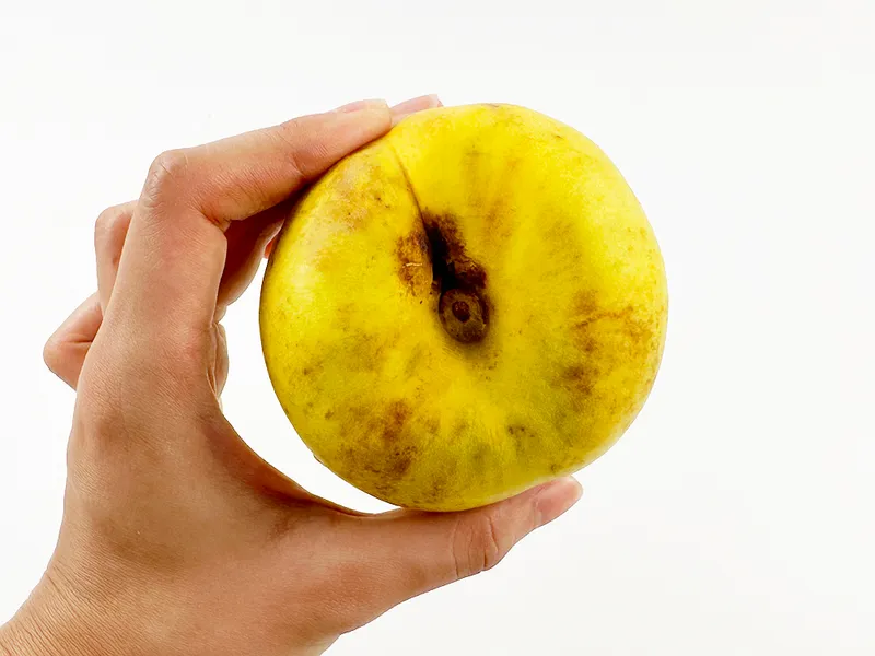 황유반도 천도 납작복숭아는 품종 특성상 꼭지 부분에 갈라짐이 발생할 수 있습니다. 이는 상품 이상이 아니며 우리나라 기후 특성상 납작복숭아 품종에서 흔히 일어나는 현상 중 하나입니다.