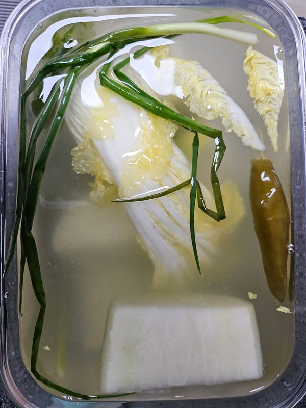 5키로가 건더기는 조금들어있고 국물로 채워진듯하네요. 집에 있는 무와 알배추 절여 조금 첨가했어요. 약간 조미료맛도 나요.
