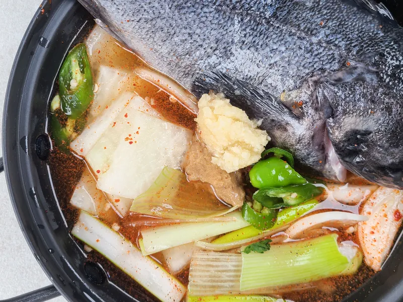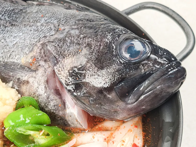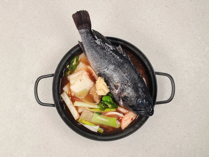 태안에서 잡힌 국내산 특 우럭 한 마리를 통째로 넣은 우럭 매운탕입니다. 우럭을 통으로 넣어 더욱 진하고 시원한 국물 맛을 경험하실 수 있어요! 끓이면 끓일수록 지방이 우러나와 국물에 깊은 맛을 더합니다.