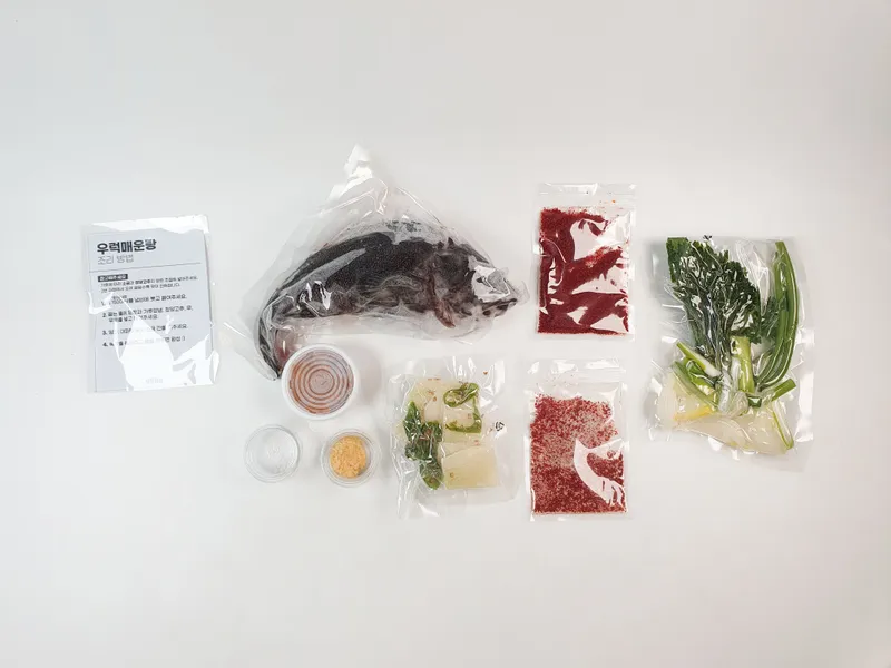 우럭, 다진마늘, 소금, 쑥갓, 양파, 대파, 고추, 무, 된장, 새우가루, 후추, 고춧가루 등 우럭 매운탕에 필요한 제품들로 구성되어 있습니다.