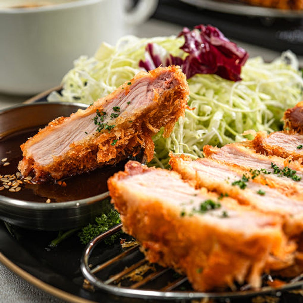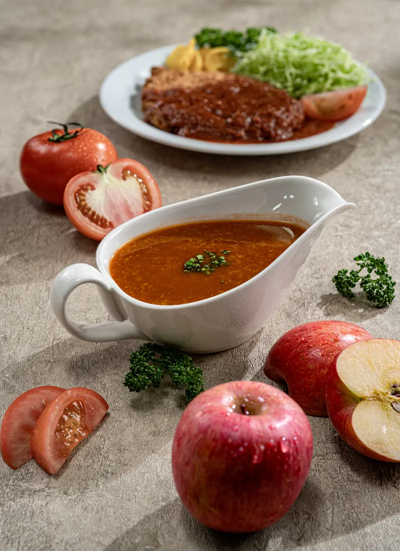 사과, 양파로 풍미를 살렸습니다. 육수와 채소를 오랜 시간 끓여 낸 깊고 부드러운 돈까스 소스! 달콤한 사과의 풍미, 소스 속 과일 향이 부드러운 풍미를 더해 느끼함을 잡고 식욕을 당깁니다.