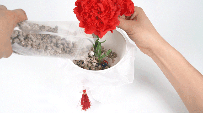 실제 마사토를 제공해 드리고 있어요! 진짜 화분처럼 위장할 수 있도록 꼼꼼하게 준비했답니다. 또, 카네이션 역시 진짜 생화 같은 조화로 구성하였답니다.