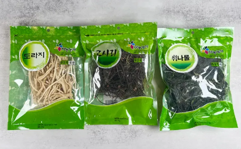 도라지 50g·고사리 70g·취나물 70g이 들어 있어요. 건나물은 일반 나물에 비해 유통기한이 더 길어 보관하기 좋아요. 우리 땅에서 정성껏 키운 국산 농산물만 취급합니다.