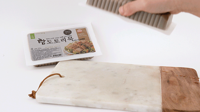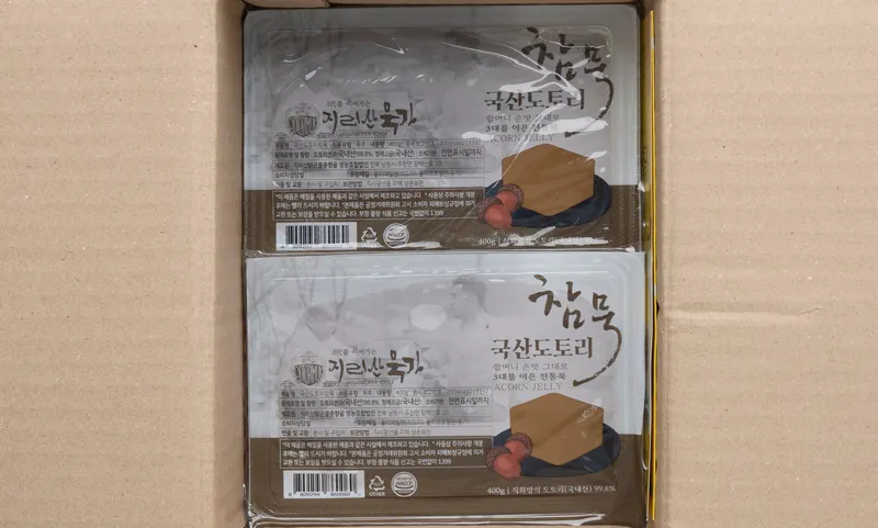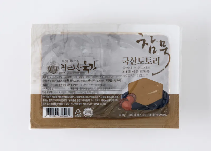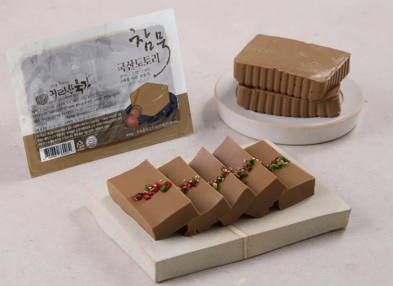 도토리묵의 탱글탱글함이 느껴지시나요? 100% 국산 도토리로 만들어 담백하면서도 진한 쌉싸름한 맛이 느껴지는 참 도토리묵입니다.