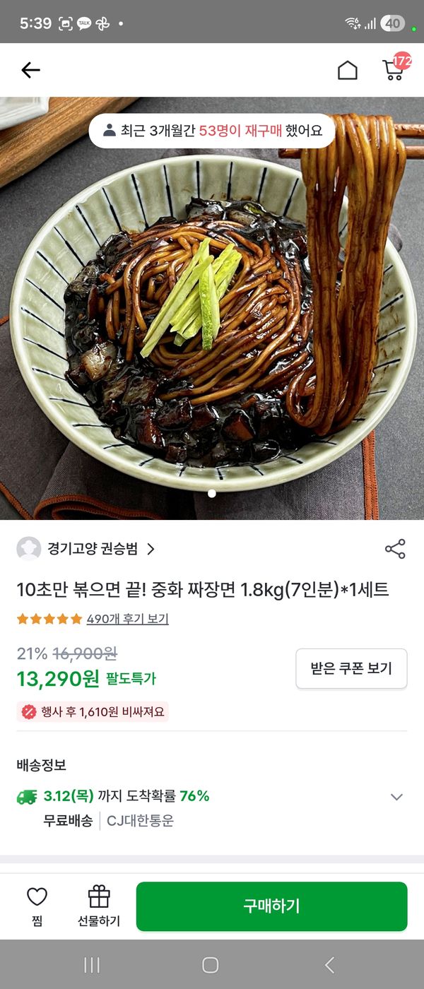옵션: 중화 짜장면 1.8kg(7인분)*1세트