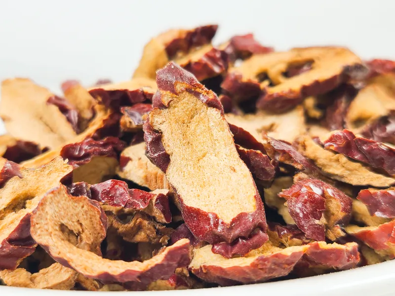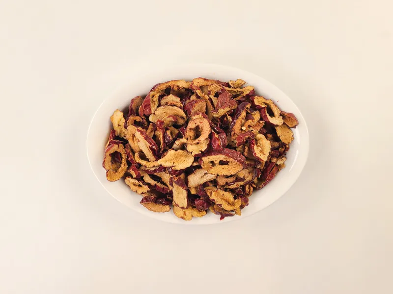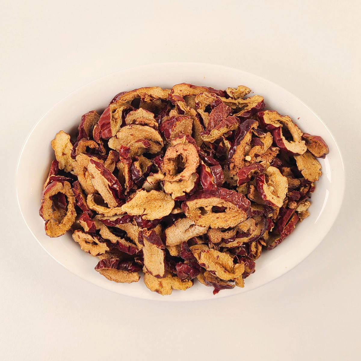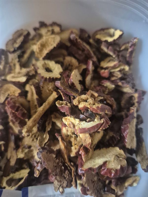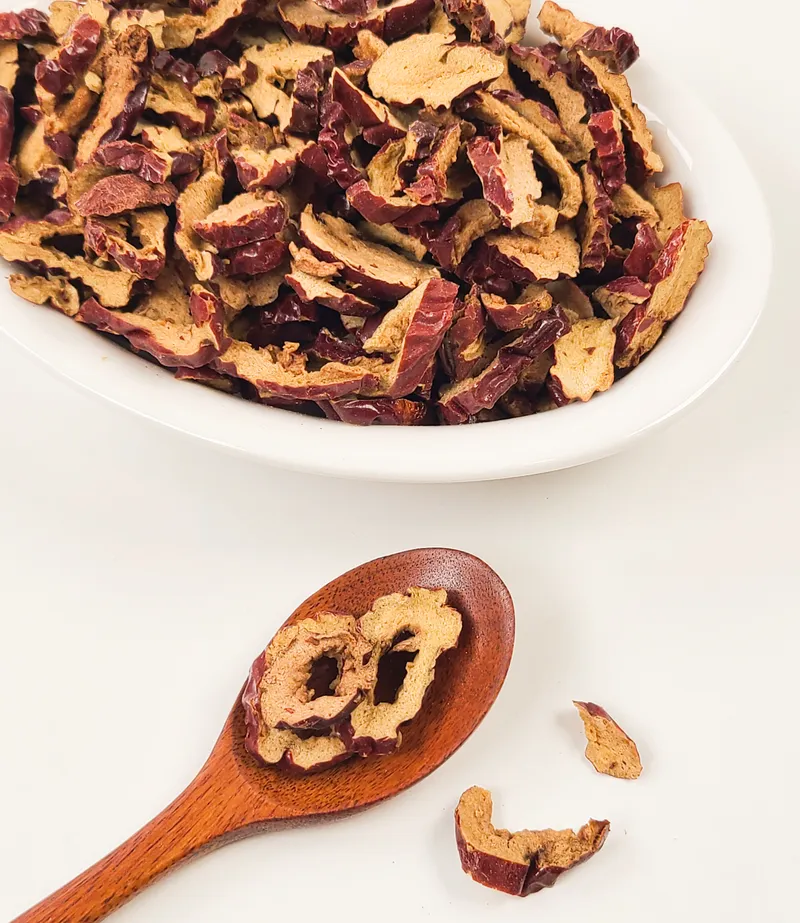 경산에서 수확한 싱싱한 대추의 씨를 제거해 얇게 슬라이스했습니다. 완전히 건조해 바삭바삭 씹는 식감이 일품이에요. 씹을수록 달콤함이 입안에서 퍼져 입 심심할 때 과자 대신 집어먹기 좋아요.